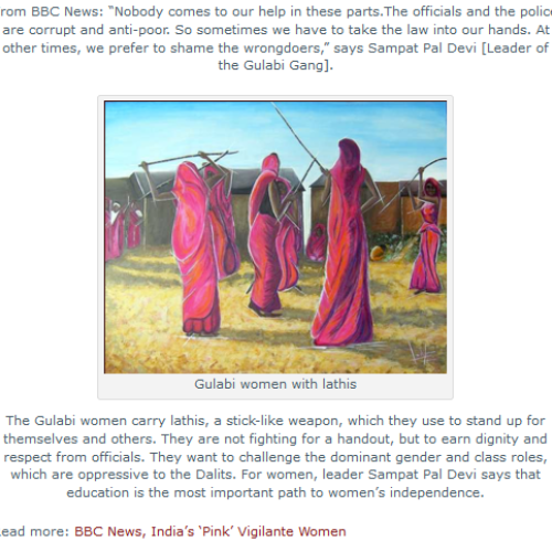 Avec mon autorisation, cette toile a été choisie comme emblème par Sampat Pal Devi pour illustrer une publication sur les sarris roses ou Gulabi Gang, sur la toile internationnale :